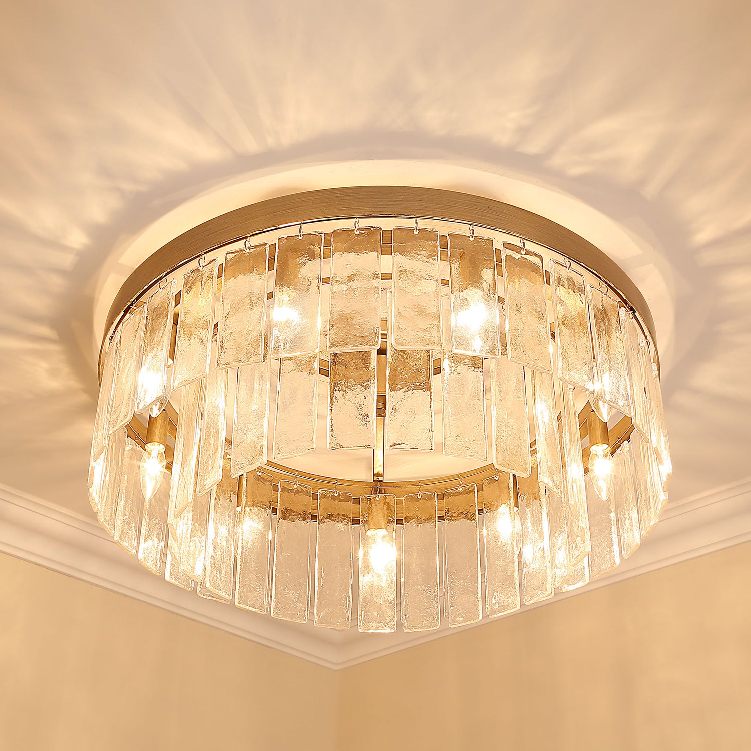 Stunning and dramatic, Ciara is a clean, contemporary design. Like sheets of ice, panels of Hammered Water Glass hang from wide metal hoops. The glass pieces form a layered drum shade enclosing the inner lamps. The diffused light allows admirers to experience the beauty of transparent glass without blinding glare. Choose between two sophisticated finishes: Matte Black and White Gold.