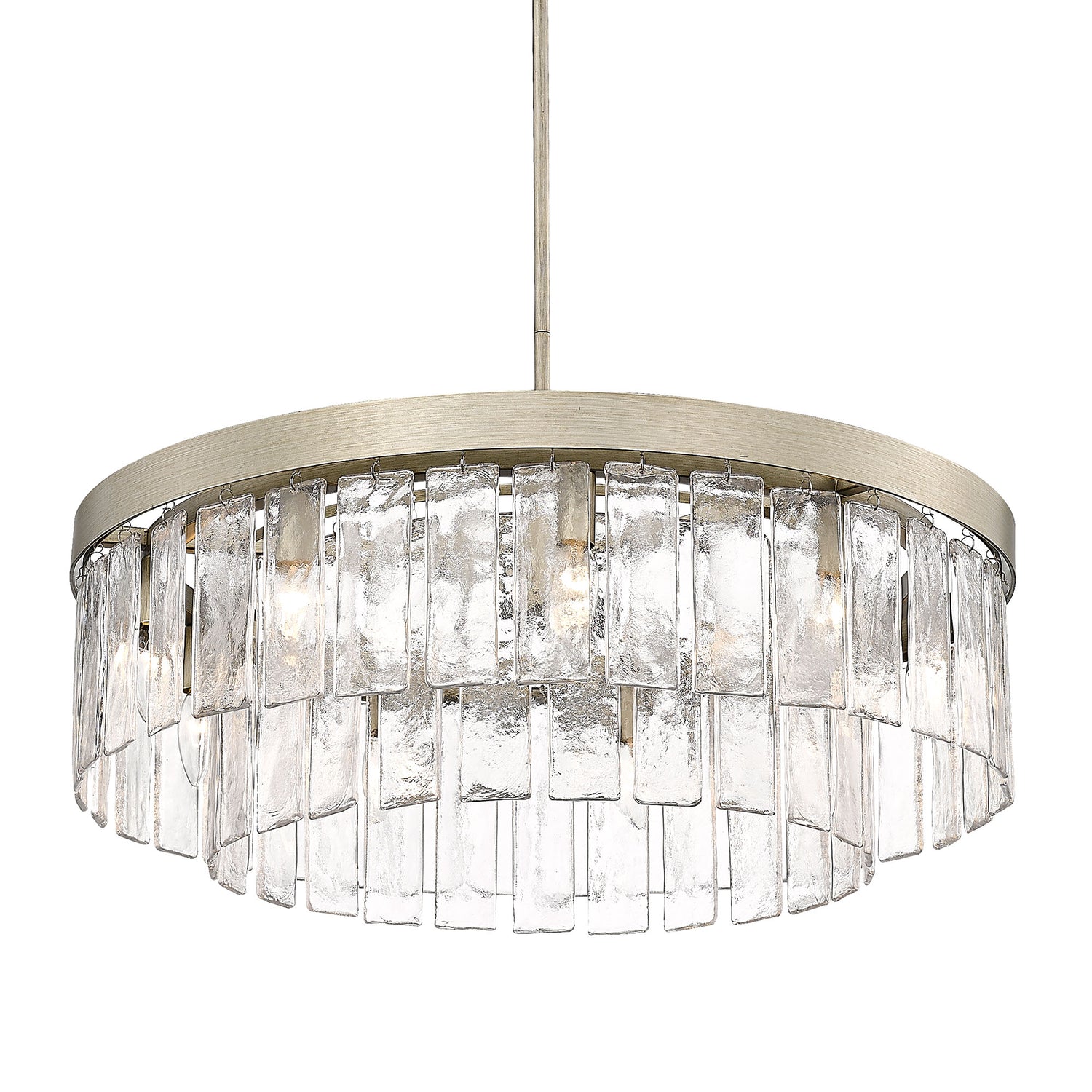Stunning and dramatic, Ciara is a clean, contemporary design. Like sheets of ice, panels of Hammered Water Glass hang from wide metal hoops. The glass pieces form a layered drum shade enclosing the inner lamps. The diffused light allows admirers to experience the beauty of transparent glass without blinding glare. Choose between two sophisticated finishes: Matte Black and White Gold.