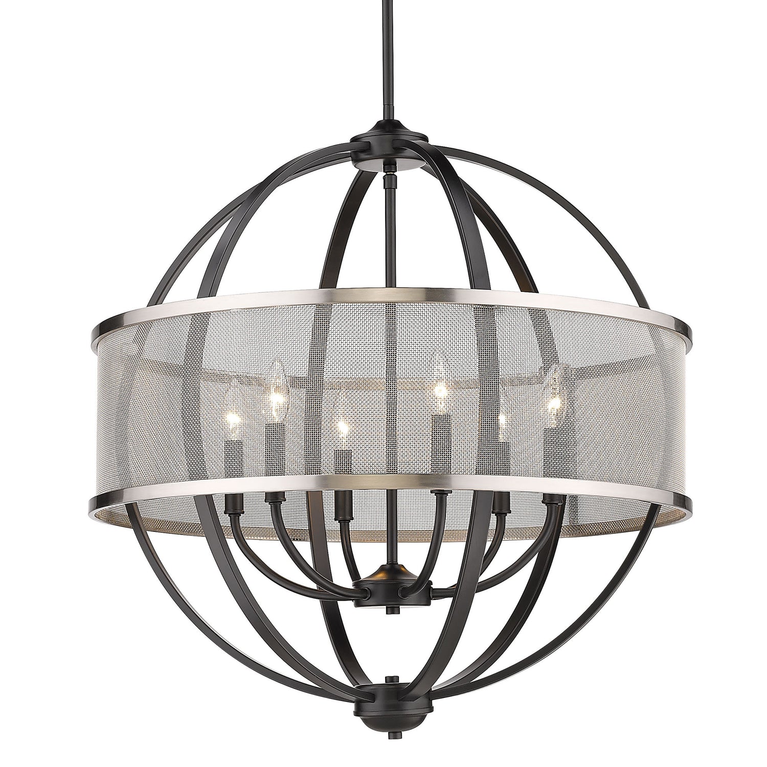 Colson is a collection of transitional and industrial-chic fixtures. Ideal for lofts, farmhouses and contemporary interiors, curvaceous arms sit inside simple round frames. The collection offers an extensive line of ceiling fixtures. Fixtures may be purchased with or without metal mesh shades. The optional shades shield the exposed bulb of these elemental fixtures. The fixtures are available in a variety of modern finishes. This 6-light chandelier creates a stylish focal point with warm ambient lighting that is perfect for intimate living and dining areas or task lighting.