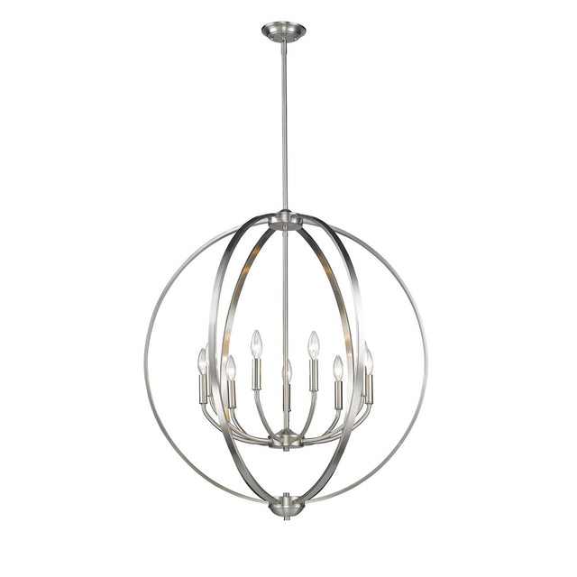 This transitional and industrial-chic design is ideal for lofts, farmhouses, and contemporary interiors. Curvaceous arms sit inside simple round frames. The extensive collection includes wall and ceiling fixtures. Fixtures may be purchased with or without metal mesh shades. The optional shades shield the exposed candelabra bulbs of these elemental fixtures. Available in multiple finishes, this 9-light chandelier creates a dramatic focal point graciously sized for larger living and dining areas.
