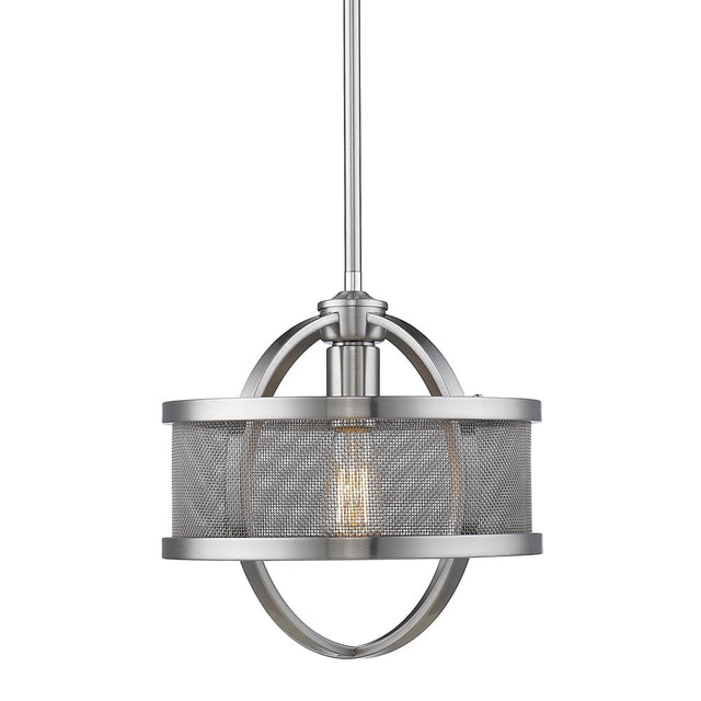 This transitional and industrial-chic design is ideal for lofts, farmhouses, and contemporary interiors. Curvaceous arms sit inside simple round frames. The extensive collection includes wall and ceiling fixtures. Fixtures may be purchased with or without metal mesh shades. The optional shades shield the exposed bulb of these elemental fixtures. Available in multiple finishes, this mini pendant is an eye-catching accent that creates a soft glow for task lighting. It can be hung individually or arrayed in a group.