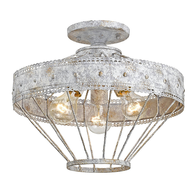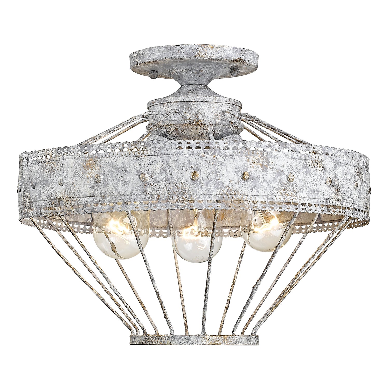 Ferris is a casual, vintage-inspired design that was created for eclectic or farmhouse decors. The unique metal work features a scallop detail and a multi-layered, hand-painted finish. Available in two rustic patina finishes which create a chic, but weathered look. This semi-flush creates a generous open area for widespread ambient lighting.
