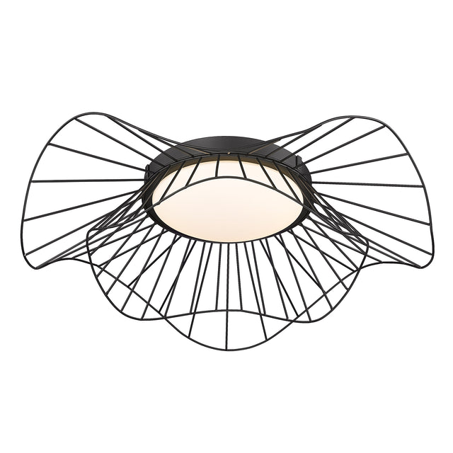 Artful and uncompromised, Elena stretches the imagination of contemporary close-to-ceiling lighting. An oversized wireframe is sculpted into alternating bends and curves to form an attractive, organic pattern. A slightly textured Natural Black finish contrasts an opal glass shade. Beneath the shade, an integrated LED shines brightly. Hang these damp-rated fixtures throughout your home.