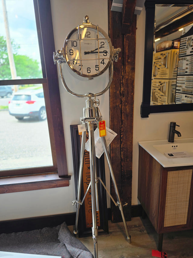 This metal tripod floor clocks design offers a unique twist on a vintage spot light, inspired by the nautical search lights used in marine rescues of days past.