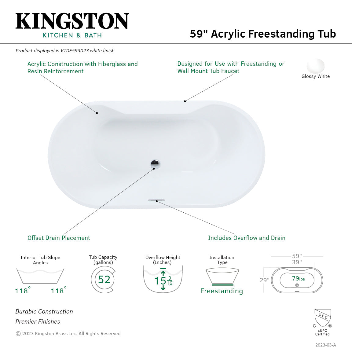 Elevate your home's contemporary decorum, while you effortlessly recline in the cozy embrace of a Kingston Brass freestanding bathtub. Highly acclaimed for its clean and contemporary yet minimalist shape, this tub will be made the focal point in many bathrooms. The 59-inch acrylic freestanding tub with drain will wholly beautify your home for years to come thanks to its durable and easily repairable acrylic construction. This bathtub is finished inside and out in a brilliant, high-gloss white that ensures crisp aesthetics and easy care now and well in the future.