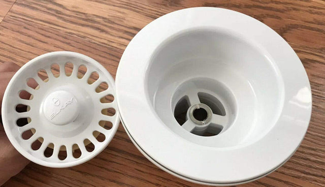 Finish: glacier white polymer drain outlet fitting with removable basket strainer with rubber stopper. Designed to fit 3-1/2' drain opening with an overall flange size of 4-1/2'.