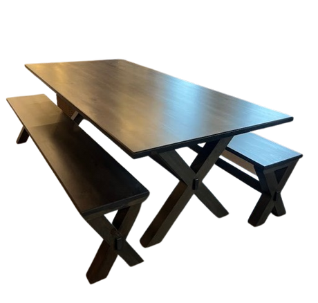 ✅ Ready for Pick Up!Sale price $6,50000 Regular price $6,90000UnavailableMountain View Woodworking 96" x 44" FarmHouse Trestle Table w/Benches