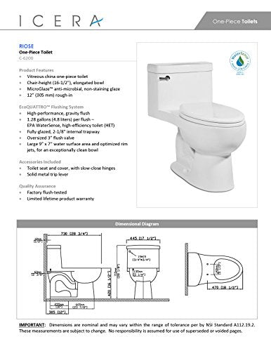 Low stock (2 units)Icera CANTO II One-Piece Toilet EPA WaterSense 1.28 gpf Chair-Height, Elongat...